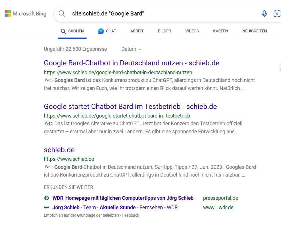 - Site-spezifische Suche: Mit site:<URL> beschränkt ihr die Suche auf eine bestimmte Website. site:schieb.de KI-Tools sucht also nur auf schieb.de nach KI-bezogenen Inhalten.