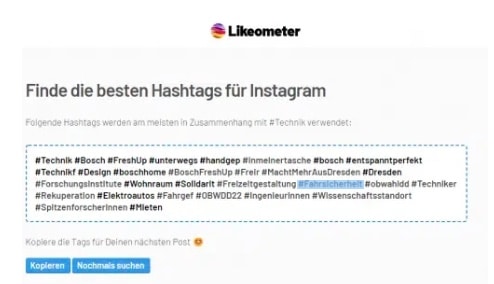 - Der Hashtag-Explorer von LikeOmeter generiert euch zu einem Hashtag bis zu dreißig weitere, ähnliche Hashtags. So könnt ihr in eurem Beitrag die Hashtags aufnehmen, nach denen die Leser mit hoher Wahrscheinlichkeit suchen werden.