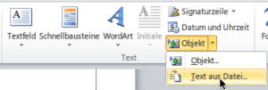 Verwenden Sie Word 2007 oder 2010, setzen Sie die Schreibmarke an die Stelle im Dokument, an der die Inhalte eingefügt werden sollen. Wechseln Sie dann oben im Menüband zum „Einfügen“-Tab. Auf der rechten Seite sehen Sie eine Schaltfläche „Objekt“. Hier öffnen Sie das Ausklappmenü per Klick auf den kleinen Pfeil an der rechten Seite. Nun aus dem Menü „Text aus Datei…“ wählen. Suchen Sie jetzt die einzufügende Datei. Im Dialogfeld „Datei einfügen“ eventuell von „Alle Word-Dokumente“ auf „Textdateien“ umschalten, falls gewünscht.