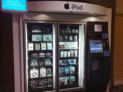 Kaum zu glauben. Man könnte es auch mit Asterix sagen: Die spinnen, die Amis. In Las Vegas stehen tatsächlich Automaten herum, an denen man einen iPod ziehen kann. Im ernst: Ob iPod Touch, Nano, Classic oder Shuffle – einfach die passende Taste drücken. Auch Kopfhörer und andere Extras lassen sich so kaufen. Kreditkarte genügt. Solche Automaten stehen zum Beispiel im Las Vegas Hilton Hotel – und am Flughafen. Kollege Postinett alias Gadgetwatcher hat die entdeckt und auch ein Foto davon gemacht.