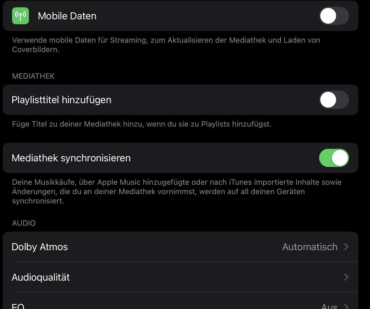 Falls ihr zur lokalen Synchronisation zurückkehren wollt, geht ihr denselben Weg: iOS-Einstellungen > Musik > „Mediathek synchronisieren“ deaktivieren. Auf dem Mac: Musik-App > Einstellungen > „Mediathek synchronisieren“ ausschalten.