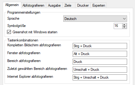 Wichtig sind die unterschiedlichen Tasten, mit denen Sie das Aufnehmen der verschiedenen Arten von Bildschirmfotos auslösen können. Für den kompletten Bildschirm, das aktuelle Fenster, einen Bereich, den zuletzt gewählten Bereich (bei sich ändernden Bildschirminhalten) und den Internet Explorer können Sie unterschiedliche Tasten vergeben.