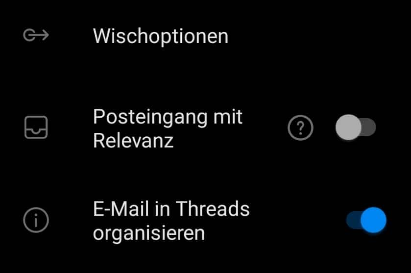 Unter Wischoptionen könnt ihr festlegen, was beim Wischen mit dem Finger über eine E-Mail nach links oder rechts passiert. Ideal: Mit dem Wischen in die eine Richtung löscht ihr die E-Mail, in die andere verschiebt ihr sie in einen dann festzulegenden Ordner. Diese Konfiguration spart enorm viel Zeit im Alltag.
