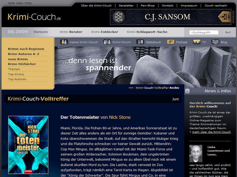 Wem der Sinn nach Selfmade-Thriller-Feeling ist, sollte sich auf www.krimi-couch.de umschauen. Hier dreht sich alles um Krimis. Welche Bücher sind gerade neu erschienen, welche taugen was, was passiert und welche davon kommen auch bei anderen Lesern gut an?