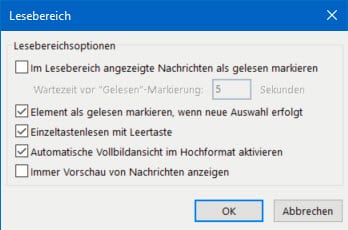 Um das Problem an der Wurzel zu packen, schaltet einfach die automatische Markierung der E-Mails aus. In Outlook klickt dazu auf Datei > Optionen > Erweitert. Klickt dann auf die Schaltfläche Lesebereich. Hier findet sich eine Vielzahl von Optionen, wann und wie E-Mails als gelesen markiert werden. Probiert die für euch passenden einfach aus!