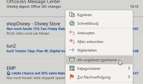 Generell gilt: Die Mails, die ungeöffnet sind, sind noch unbearbeitet. Leider ist im Standard eingestellt, dass Mails nach dem Öffnen automatisch als gelesen markiert werden. Hier kann manuell nachgebessert werden: Klickt eine E-Mail an, die als gelesen markiert ist, dann klickt mit der rechten Maustaste darauf und dann auf Als ungelesen markieren. Alle markierten E-Mails werden nun wieder so dargestellt, als wären sie noch nie geöffnet worden.