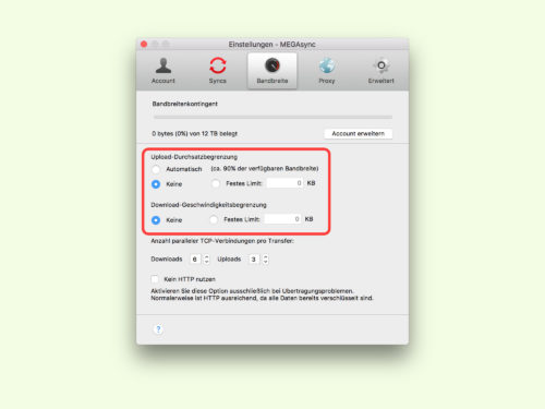 So bleibt mehr Geschwindigkeit für andere, wichtigere Programme als die Übertragung von Dateien in die und aus der Cloud, die sich im Hintergrund halten sollte. Um die MEGA-Cloud über das Sync-Programm für Mac oder Windows zu drosseln, zunächst auf das MEGA-Symbol im Menü klicken.
