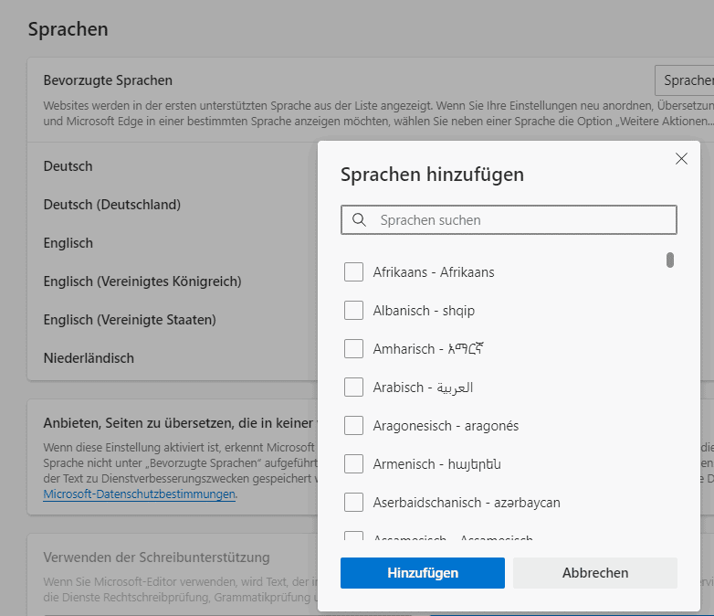 Edge unterstützt mittlerweile über 100 Sprachen für die Rechtschreibprüfung. Wenn ihr Texte in einer neuen Sprache schreibt, könnt ihr diese einfach hinzufügen: