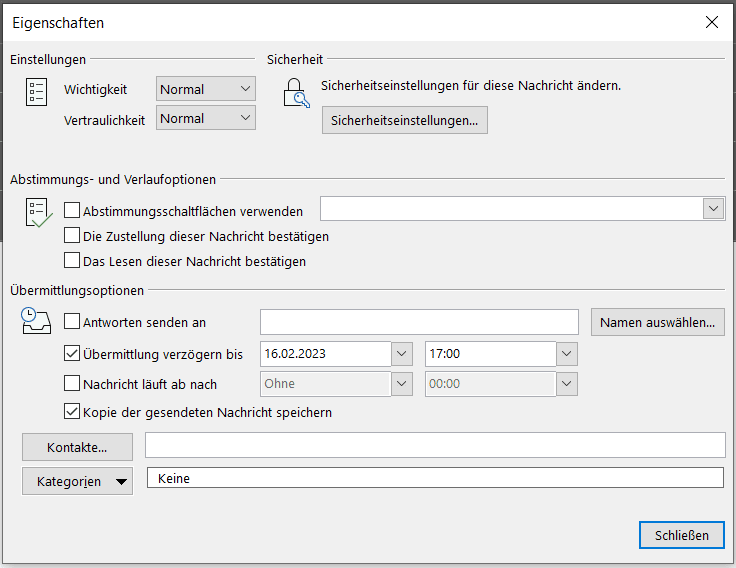 - Sendet die E-Mail normal ab. Outlook stellt sie in den Postausgang, wartet aber mit dem tatsächlichen Versand bis zum konfigurierten Zeitpunkt.