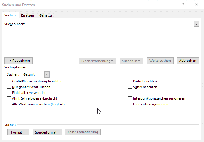 - Klickt auf die Schaltfläche Suchen. Hier könntet ihr jetzt direkt eine Suche nach einem Begriff starten. Diese würde den Begriff exakt so wie eingegeben suchen und Groß- und Kleinschreibung außer Acht lassen.