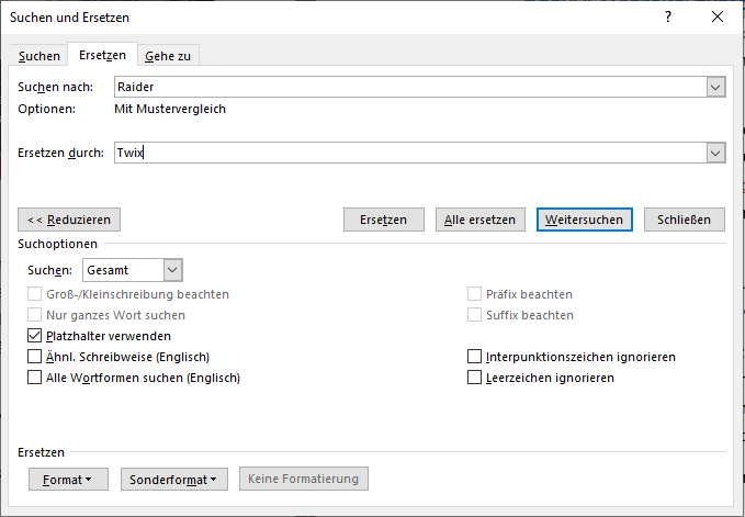 Im Eingangsbeispiel wisst ihr ja schon, dass ihr „Raider“ durch „Twix“ ersetzen wollt. Da ist die reine Suche nur der erste Schritt. Das automatische Ersetzen ist aber vor allem bei einem langen Text risikoreich, vor allem, wenn der Suchbegriff nicht so eindeutig abgegrenzt ist wie im Beispiel: Schnell rutscht euch ein Vorkommen durch, wo er unverändert bleiben sollte.