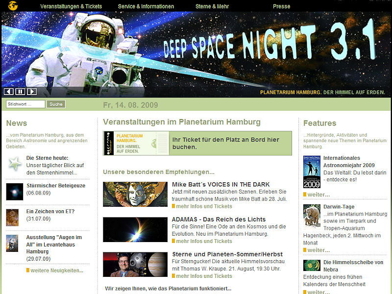 Wer den Sternen nahe sein will, wird Astronaut oder lässt sich als Tourist von der NASA ins All schießen – falls er denn das millionenschwere Dollar-Ticket stemmen kann. Normalsterblichen bleibt nur das Planetarium. In Hamburg steht ein ganz besonderes: Hier können Besucher nicht nur ins Himmelsgestirn gucken, es gibt auch jede Menge Infotainment rund um Sonnensystem und Milchstraße. In enger Kooperation entwickeln Wissenschaftler, Pädagogen, Künstler und Dramaturgen zeitgemäße Formen von Wissenstransfer. Die Webseite des Planetariums lässt auch virtuelle Besucher an diesem reichhaltigen Schatz teilhaben.