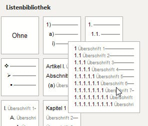 Markiert die gewünschte Überschrift (z.B. Überschrift 1), dann klickt ihr in der Registerkarte Start im Bereich Absatz auf das Symbol für Liste mit mehreren Ebenen (das dritte Symbol in der oberen Reihe). Wählt dann eines der verfügbaren Überschriften-Formate aus der Bibliothek aus.