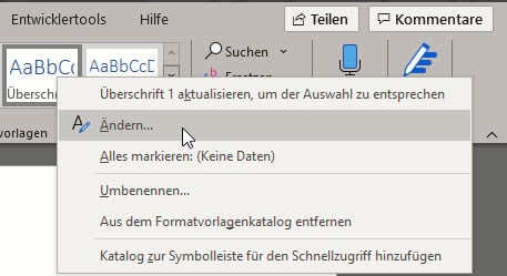 Für eine dauerhafte Lösung klickt ihr in Formatvorlagen mit der rechten Maustaste auf das Überschriftenformat, was ihr gerade gewählt habt und auf Ändern.