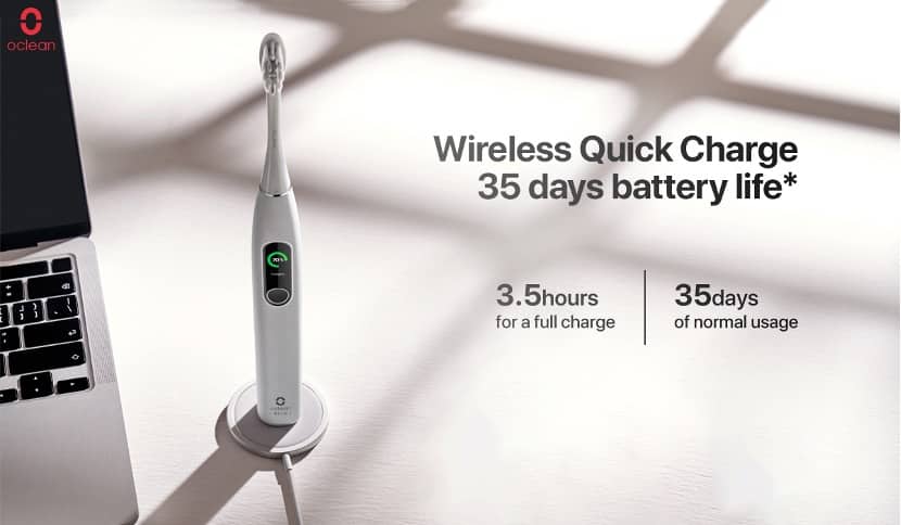Auch wenn es um die Laufzeit des Akkus geht, hat die Oclean X Pro Elite Zahnbürste einen neuen Durchbruch geschafft, denn sie ist die erste schnellladende Zahnbürste weltweit, die mit einem kabellosen Ladegerät kompatibel ist. Durch das optimierte kabellose Schnellladen braucht es nur 3,5 Stunden, um die Zahnbürste komplett aufzuladen und die Akkulaufzeit hält bis zu 35 Tagen, wodurch die potentiellen Sicherheitsrisiken beim Laden im Badezimmer erheblich reduziert werden.