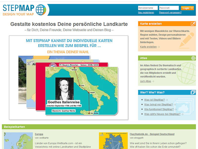 Im Internet eigene Landkarten zu erstellen ist mit Hilfe von Onlinediensten wie Google Maps, Bing Maps und Co. schon lange bequem möglich. Die kostenlos bereitgestellten Onlinekarten lassen sich per Mausklick erweitern und so personalisieren. Doch was das Kartenmaterial selbst betrifft, gibt es enge Grenzen. In punkto Individualisierung einen deutlichen Schritt weiter geht der Onlinedienst www.stepmap.de. Hier kann jeder kostenlos ein individuelles Kartenlayout erstellen und diese mit Texten, Fotos, Kommentaren oder Videos anreichern.