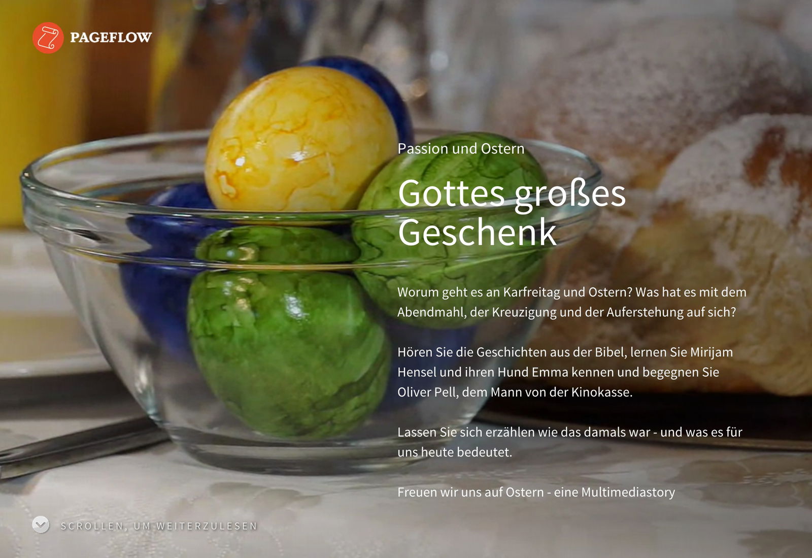 Pageflow ist ein Tool, das der WDR entwickelt hat und jeder kostenlos für sogenanntes „multimediales Storytelling“ nutzen kann. Das Projekt zeigt eindrucksvoll, was mit Pageflow alles möglich ist. Man taucht einfach ein: Worum geht es an Karfreitag und Ostern eigentlich? Was hat es mit dem Abendmahl und der Kreuzigung auf sich?
