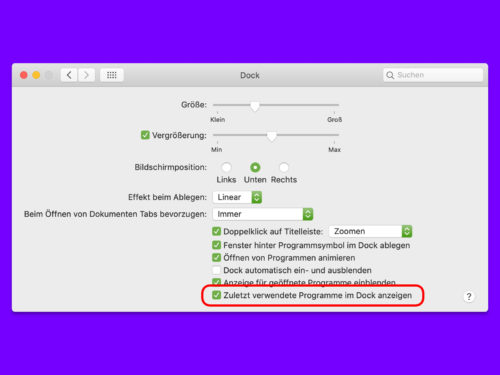 Das Dock in macOS Mojave enthält eine neue Funktion, die kürzlich verwendeten Programme neben den normalen Dock-Icons anzeigt. Der Bereich passt sich automatisch an und aktualisiert sich automatisch, wenn Sie Programme starten und beenden. Wer den Bereich nicht braucht, blendet ihn einfach aus.