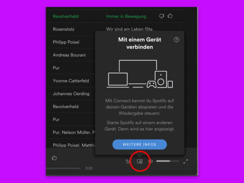 Oft will man Musik nicht direkt am PC oder Handy hören, sondern beispielsweise auf einem drahtlosen Lautsprecher. Mit Spotify Connect kann die Wiedergabe an jedem gerade genutzten Gerät gesteuert werden – egal, ob im gleichen Netzwerk oder von anderswo.