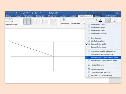 Sowohl in Excel als auch in Word lassen sich Tabellen mit eigenen Designs gestalten. Zum Beispiel wird die obere linke Ecke einer Tabelle gern schräg aufgeteilt, was Platz für die Beschriftung der Zeilen und der Spalten schafft. Dieses Design kann in Word mit wenigen Klicks nachgebildet werden.