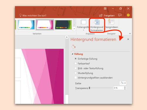 Welche Farbe für den Hintergrund der einzelnen Folien in einer PowerPoint-Präsentation zum Einsatz kommt, richtet sich nach dem jeweiligen Design. Allerdings lässt sich die Farbe, mit der die Folien hinter den Inhalten gefüllt werden, auch manuell anpassen. Wir zeigen, wie das geht.