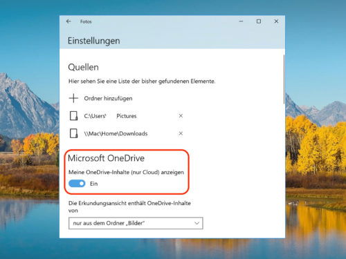 Nutzer von Windows 10 wissen: Microsoft hat den Cloud-Dienst OneDrive schon ins System integriert. Das gilt auch für die Fotos-App – wer bei OneDrive eingeloggt ist, sieht nicht nur Bilder von der lokalen Platte, sondern auch solche, die in der Cloud gespeichert sind. Wer das nicht will, stellt die Verlinkung ab.