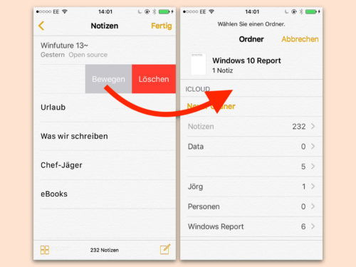 Notizen können am iPhone entweder lokal oder in der iCloud abgelegt werden. Wer umziehen will, muss nicht jede geschriebene Notiz einzeln verschieben. Das geht auch gleich mehrfach.