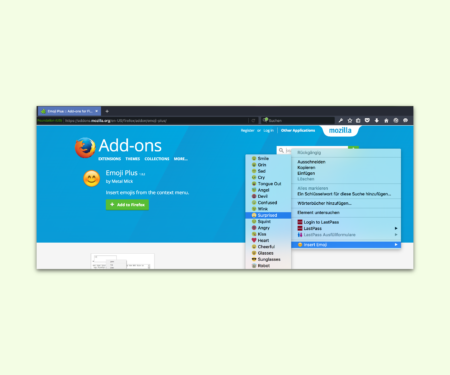 In Desktop-Browsern werden Emoji-Gesichter nicht unterstützt. Einzige Ausnahme ist der Mac. Mit einem Add-On können Emoji beim Firefox-Browser in jedes Textfeld eingefügt werden.