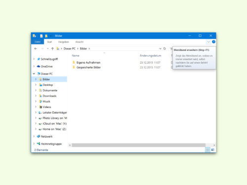 Am oberen Rand des Explorers findet sich, ähnlich wie in Microsoft Office-Programmen, eine Leiste mit den Menü-Befehlen. Um Platz zu sparen, blendet Windows dort normalerweise aber nur die Titel der verfügbaren Tabs ein. Die zugehörigen Optionen werden erst beim Anklicken sichtbar. Das geht auch einfacher.