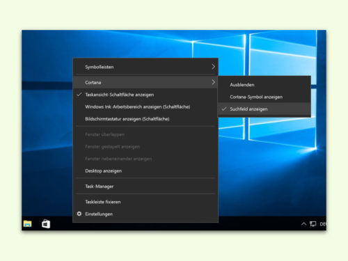 In Windows 10 kann man das Such-Feld, die Assistentin Cortana oder sogar beides ausblenden, also unsichtbar machen. In diesem Fall erscheinen neben dem Start-Button nur die Task-Ansicht und angeheftete Apps.
