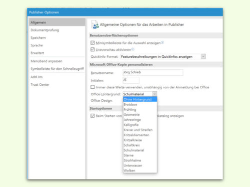Oben rechts zeigen die Office 2016-Programme ein Muster im Fenster an. Welches, das kann der Nutzer selbst einstellen. Möchte man dort am liebsten nur einen einfarbigen Kopf-Bereich sehen, ganz ohne jedes Extra-Design, lässt sich auch das leicht festlegen.