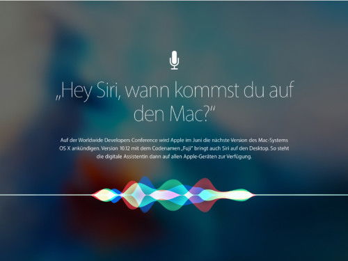 Auf der Worldwide Developers Conference wird Apple im Juni die nächste Version des Mac-Systems OS X ankündigen. Version 10.12 mit dem Codenamen Fuji bringt neben kleineren Design-Änderungen für Fenster auch Siri auf den Desktop. So steht die digitale Assistentin dann auf allen Apple-Geräten zur Verfügung.