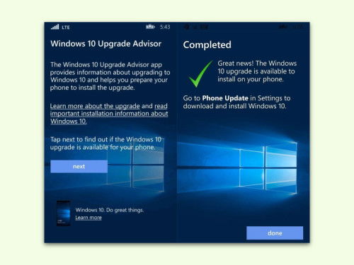 Für Windows-Smartphones bietet Microsoft eine Insider-App an, mit der man Vorschau-Versionen von Windows 10 testen kann. Eine ähnliche App, der Update Advisor, hilft beim Umstieg von Windows Phone 8.1 auf Windows 10. Der Update Advisor prüft dazu, ob für das eigene...