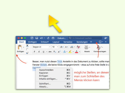 Manchmal hat man einen Text oder verschiedene Passagen in einem Dokument mit der Maus markiert. Anschließend klickt man vor lauter Gewohnheit mit der rechten Maustaste, will aber eigentlich ein ganz anderes Menü öffnen. Wenn man jetzt in das Dokument klickt, damit das falsche Menü verschwindet, hebt man damit leider auch die Markierung auf.