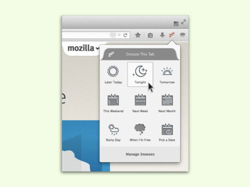 Zur besseren Verwaltung von Tabs gibt’s für den Firefox-Browser jetzt ein neues Add-On namens SnoozeTabs. Damit erstellt man keine Lesezeichen mehr für Seiten, die man später beachten will, sondern legt sie sozusagen einfach „schlafen“. Später erscheinen sie dann erneut – von ganz allein.