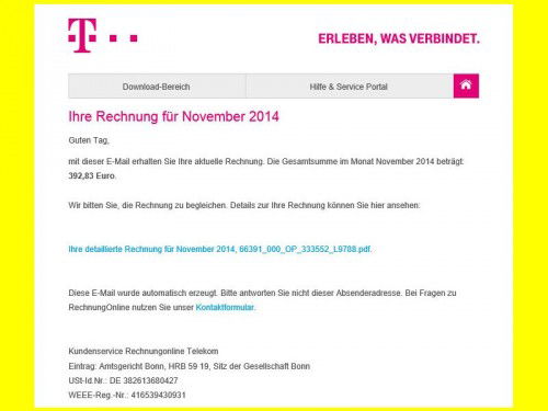 Wer immer pünktlich seine Rechnungen bezahlt, braucht sich keine Sorgen zu machen. Auch nicht, wenn dieser Tage im E-Mail-Postfach eine dringende Nachricht wegen einer unbezahlten Telekom-Rechnung auftaucht. Hier will nicht die Telekom zu Geld kommen, sondern Betrüger.