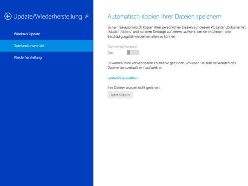 Mit dem „Dateiversionsverlauf“ werden automatisch Backups Ihrer Daten angelegt. Ähnlich wie bei der Time Machine von OSX haben Sie dabei Zugriff auf die älteren Versionen der gleichen Datei.