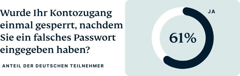 Über 61 % der Befragten in Deutschland geben an, dass schon einmal eines ihrer Konten gesperrt wurde, nachdem sie ein falsches Passwort eingegeben hatten. Je nach Konto kann dies unterschiedliche Folgen haben: Sie müssen eine gewisse Zeit warten, bevor sie es erneut versuchen können; sie müssen ihr Passwort zurückzusetzen; sie müssen das Unternehmen über andere Wege telefonisch oder per E-Mail kontaktieren.