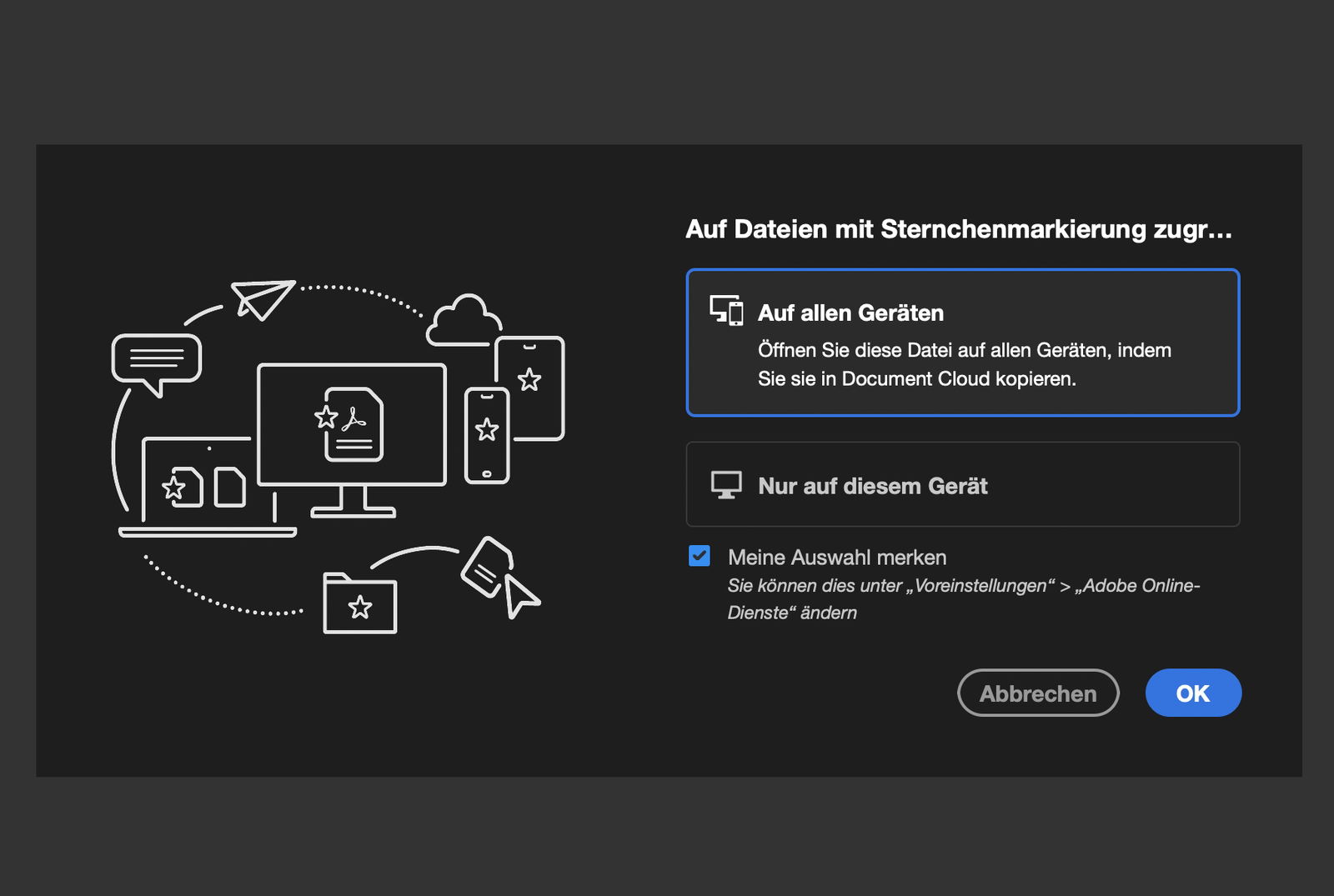 Klickt dazu in der entsprechenden PDF-Datei auf den Stern oben links in der Symbolleiste. Beim ersten Nutzen fragt der Reader euch, ob die Markierung nur das aktuelle Gerät oder geräteübergreifend sein soll. Wenn die Favoriten auf allen euren Geräten verfügbar sein sollen, benötigt ihr einen kostenlosen Adobe Account.