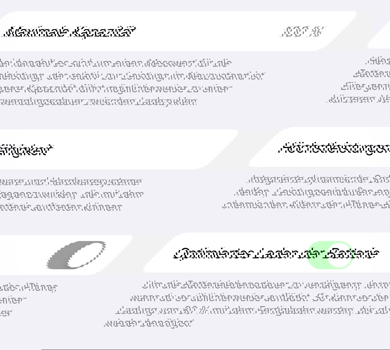 „Wie ist denn der Akkuzustand?“, eine Frage, die beim Verkauf eines Geräts mit Akku immer häufiger von potenziellen Käufern gestellt wird. Ein Akku verliert über seine Lebenszeit an maximaler Kapazität und hält dadurch weniger lange. Auch wenn das normal ist, es muss nicht sein. Bei iOS findet ihr die maximale Kapazität unter Einstellungen > Batterie > Batteriezustand und Laden (Apple hat den Menüpunkt erweitert).