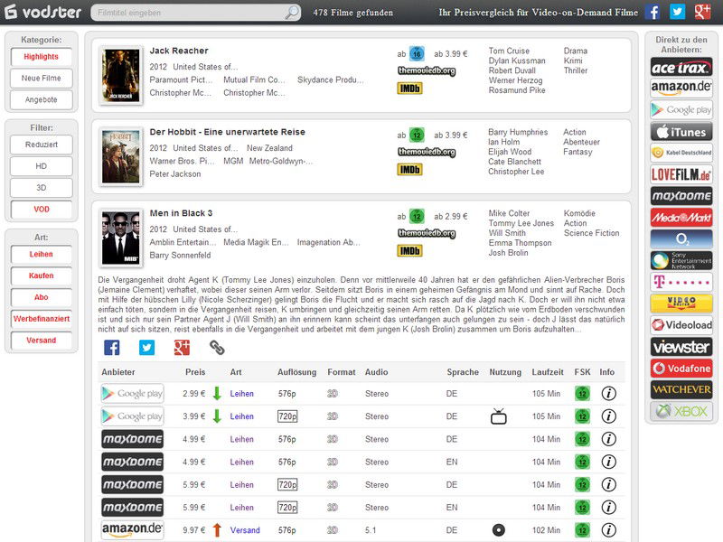 Doch bei welchem Anbieter gibt es die Filme am günstigsten? Diese Frage möchte das Preisvergleichsportal für Onlinevideos vodster beantworten. Der Preisvergleich für VoD-Filme kennt aktuell 17 Portale und deren Angebote. Auf www.vodster.de sucht der Nutzer gezielt nach einem Filmtitel oder stöbert in den Kategorien «Highlights», «Neue Filme» oder «Angebote». Unter der letzten Kategorie verstehen die Macher des Portals Filme, die kürzlich im Preis gefallen sind.