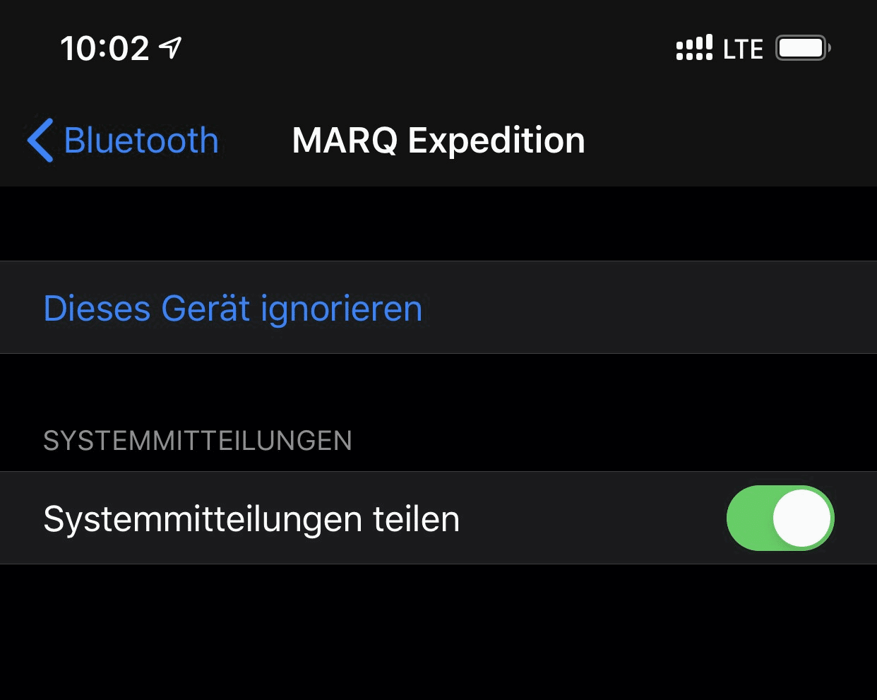 Zuerst geht ihr in die Bluetooth-Einstellungen eures iPhones. Tippt dann auf das kleine i neben dem Garmin-Gerät. Schaltet – soweit das noch nicht der Fall ist – Systemmitteilungen teilen ein. Damit wird iOS erlaubt, die Mitteilungen an das Gerät weiterzugeben. Eigentlich als Sicherheitsfunktion gedacht, ist das eine Grundvoraussetzung, um Benachrichtigungen empfangen zu können.