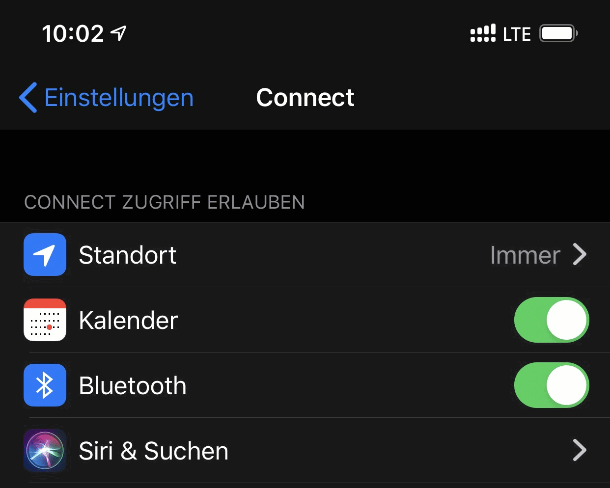 Als zweites überprüft ihr in den Einstellungen des iPhones ganz unten auf dem Bildschirm bei den Apps für Connect, ob hier Bluetooth eingeschaltet ist. Ist dies ausgeschaltet, dann verweigert iOS die Übertragung von Informationen zur Uhr. Das betrifft dann nicht nur die Benachrichtigungen, sondern auch die Synchronisation von Gesundheitswerten, die auf der Uhr aufgenommen werden.
