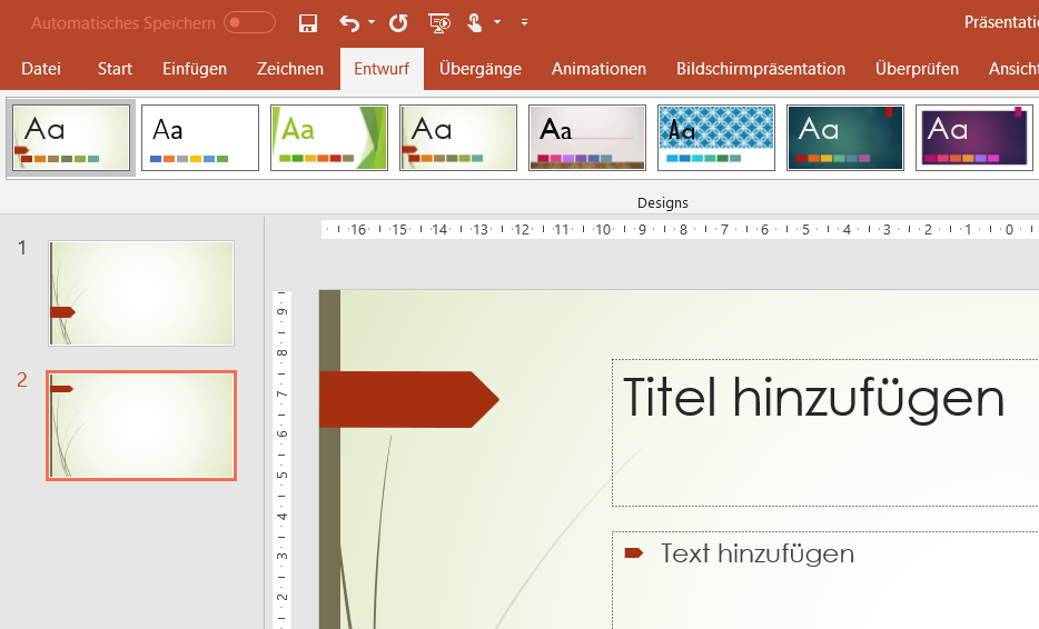 Relativ versteckt und unter dem Menüpunkt nicht unbedingt zu erwarten hat PowerPoint eine Vielzahl an Foliendesigns im Bauch: Klicken Sie auf die Registerkarte Entwurf, dann  finden Sie eine Vielzahl verschiedenen Vorlagen, die unterschiedliche Schriftarten und Farbgebungen haben. Diese können Sie schnell in der Miniaturansicht erkennen: Da stehen Groß- und Kleinbuchstaben (exemplarisch am Buchstaben A dargestellt), das Foliendesign an einer Beispielsfolie und die verwendeten Farben in einer Farbpalette.