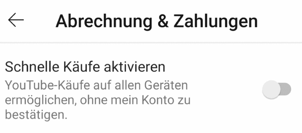 Keine Frage, das Anmelden an eurem Google-Konto für die Zahlung ist ein zusätzlicher Schritt, den man als unnötig sehen kann. Schließlich seid ihr mit der YouTube-App ja schon angemeldet, auf den ersten Blick ist das also eine Dopplung. Zumal auf einem mobilen Gerät die Eingabe eines komplexen Passwortes unkomfortabel ist. Aus diesem Grund kann in der App in den Einstellungen unter Abrechnung & Zahlungen die Option Schnelle Käufe aktivieren eingeschaltet werden.