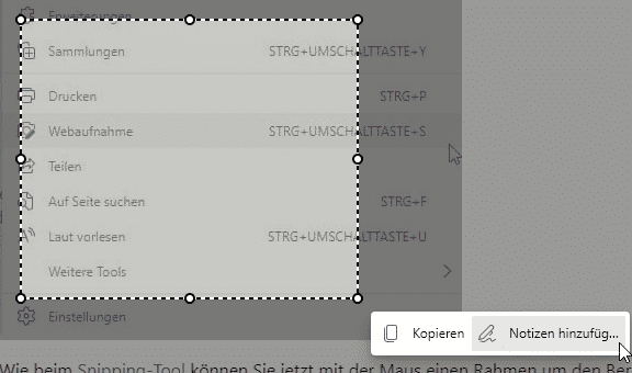 Wie beim Snipping-Tool können Sie jetzt mit der Maus einen Rahmen um den Bereich ziehen. Entweder klicken Sie dann auf Kopieren, wenn Sie den Ausschnitt über die Zwischenablage weiterverwenden wollen oder auf Notizen hinzufügen, wenn Sie diesen vorher noch bearbeiten wollen.