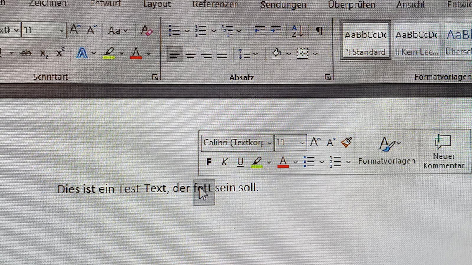 Je nach eurer Position im Dokument sind die Formatierungssymbole oft einen langen Mausweg entfernt. In Word 365 ist das Menüband zwar übersichtlicher geworden, trotzdem müsst ihr häufig erst zur Registerkarte Start wechseln, bis die Schaltflächen für Fett, Kursiv, Unterstrichen und andere Formatierungen zugänglich sind.