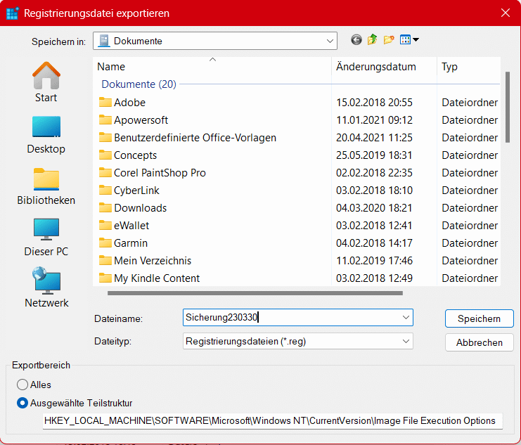 - Gebt der Sicherung einen sprechenden Namen, idealerweise sollte darin das Tagesdatum und der geänderte Bereich enthalten sein (z.B. „Registry_Taskleiste_2026-02-15.reg“).