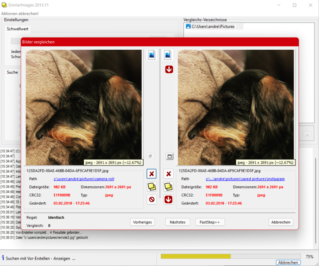 - Schwellwert richtig einstellen: Bei zu niedrigen Werten werden nur identische Bilder gefunden, bei zu hohen auch völlig verschiedene Motive. Startet mit mittleren Einstellungen und passt nach.