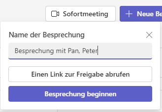 Wenn Ihr aber spontan Redebedarf habt, dann braucht Ihr ja eigentlich keinen Termin mit einem Zeitpunkt in der Zukunft, sondern wollt sofort, ohne Umwege sprechen. Teams bietet dazu die Sofortmeetings.